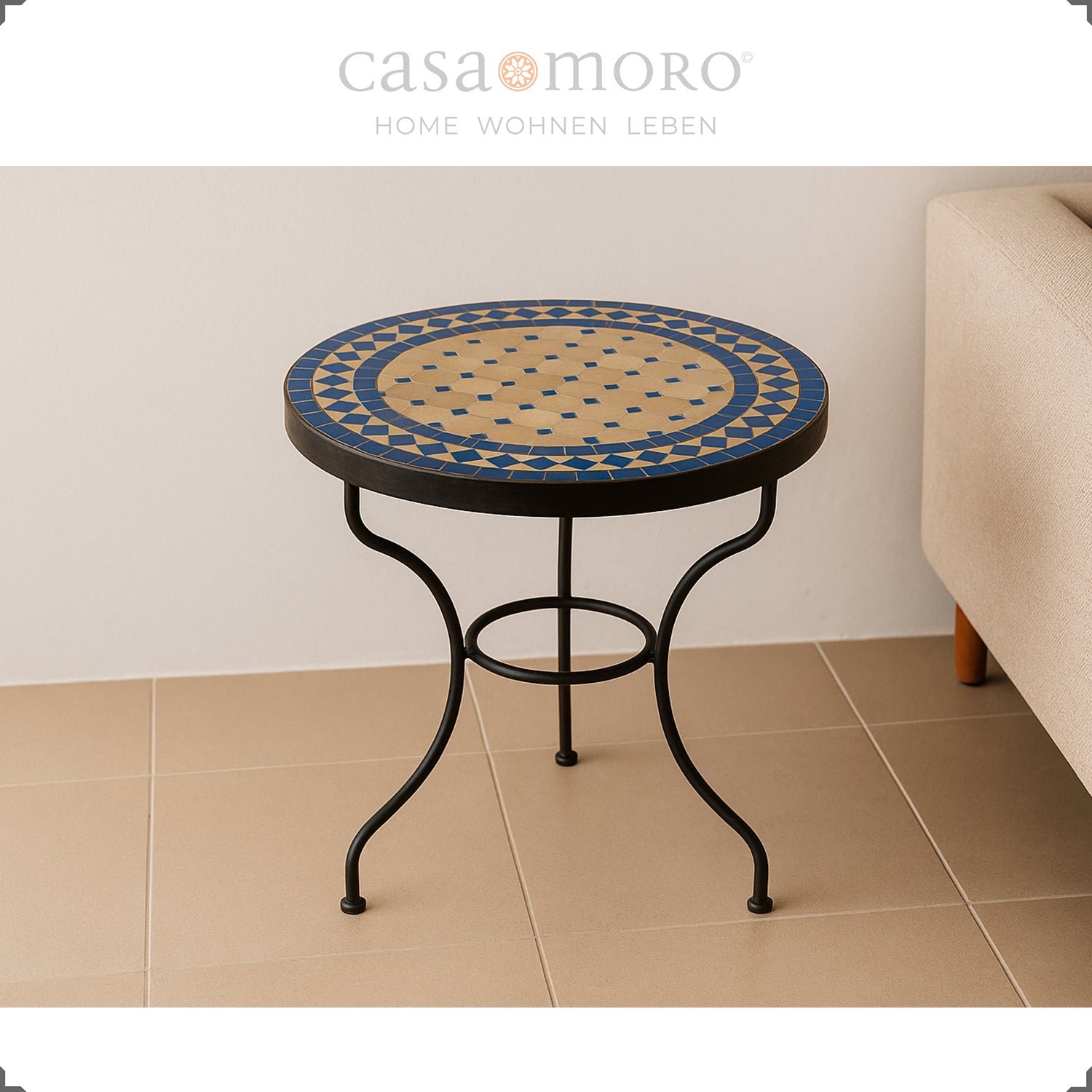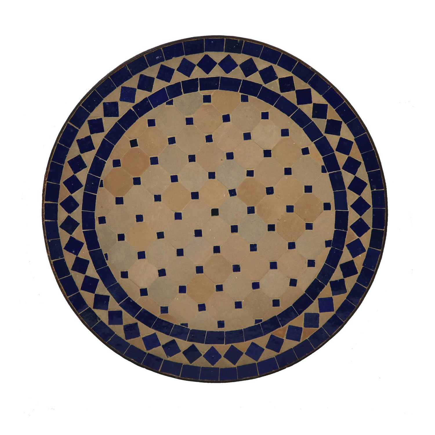 Esta pequeña mesa de 45 cm de diámetro es muy versátil: puede servir como mesa para plantas en el salón, mesita auxiliar en el balcón o mesa con mosaico para el rincón de la cocina. El diseño Zellige en azul y terracota aporta un toque mediterráneo a cualquier ambiente.