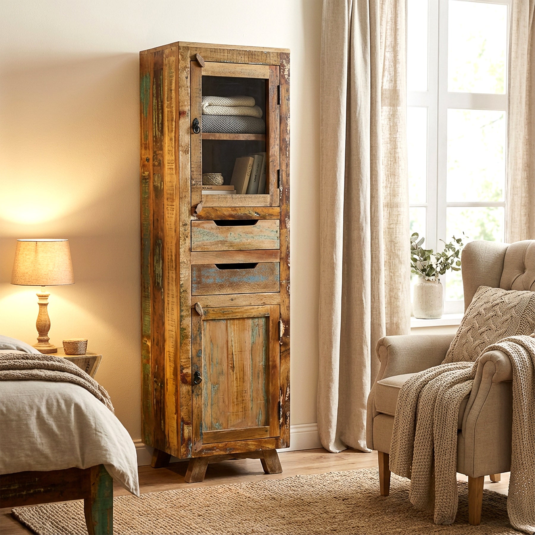 Hecho a mano con madera maciza recuperada, cada gabinete es único con matices de color individuales.