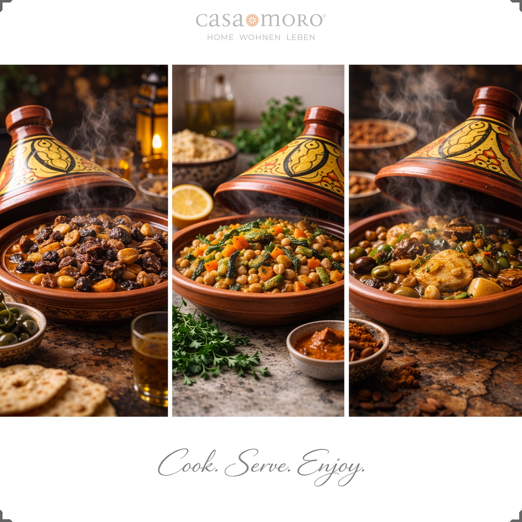 El glaseado hace que estos Tajine Especialmente agradable en el uso diario: es fácil de limpiar, tiene un aspecto de alta calidad y desprende un aroma limpio y claro. Al mismo tiempo, la cocina sigue siendo típicamente marroquí: lenta, fragante y con la sensación de que los ingredientes tienen “tiempo para desarrollarse”.