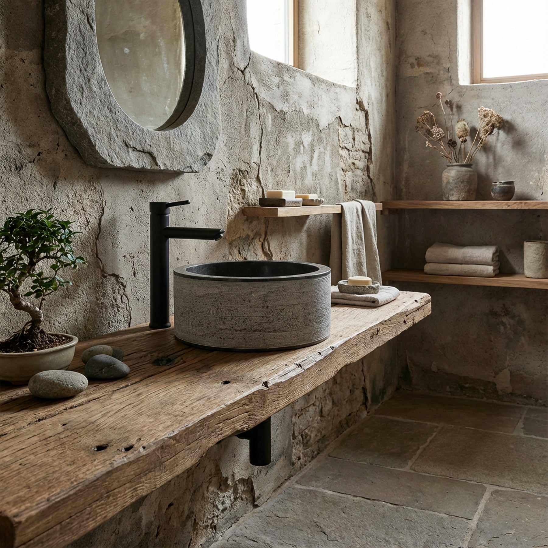 Un lavabo de piedra que aporta calma moderna a tu baño