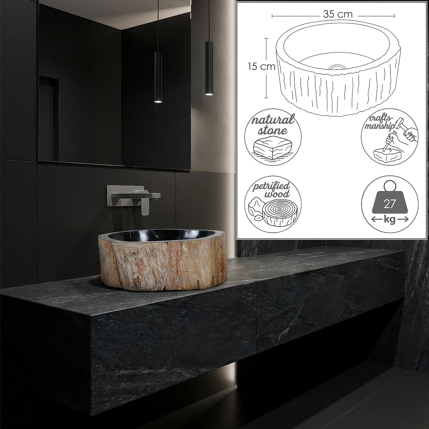 La madera fósil muestra las huellas de un cambio extraordinario: a lo largo de millones de años, las estructuras del tronco del árbol, que alguna vez fueron orgánicas, se silicificaron y se conservaron de forma permanente. La forma exterior todavía muestra la auténtica estructura vertical de la corteza, mientras que el interior parece oscuro, suavemente pulido y elegantemente brillante. Esta combinación de historia natural vivida y superficie fina hace que este lavabo sobre encimera llame la atención en baños modernos, aseos de invitados o habitaciones inspiradas en un spa.