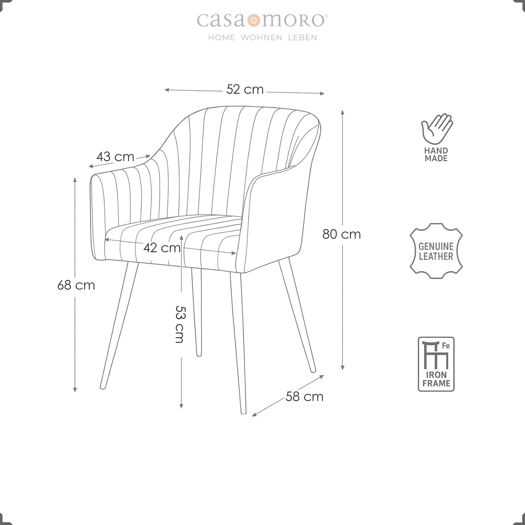 Maßzeichnung eines antikbraunen Echtlederstuhls mit Maßangaben – Breite 52 cm, Tiefe 58 cm, Höhe 80 cm, Sitzhöhe 53 cm, Armlehnenhöhe 68 cm, schwarzes Metallgestell.