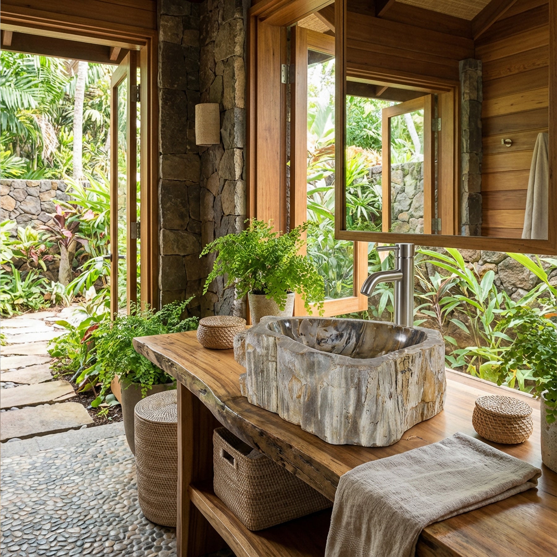 Lavabo sobre encimera de piedra fabricado en madera fósil sobre consola de madera maciza, baño abierto con vista al jardín e iluminación natural.