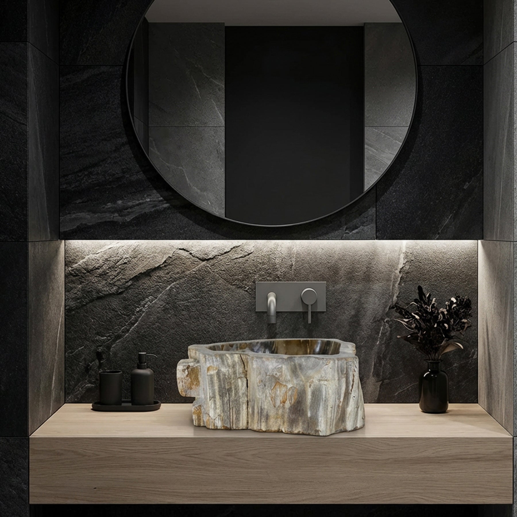 Cuando los árboles mueren y no se pudren, comienza un proceso silencioso: sus estructuras orgánicas se silicifican a lo largo de millones de años. Así se crea la madera petrificada, un material fósil en el que se conservan permanentemente las vetas originales de la madera. Las líneas orgánicas se combinan con la durabilidad de la piedra natural y forman una superficie que parece arcaica y fina al mismo tiempo. Esta profundidad de textura, color y flujo natural hace que cada lavabo sobre encimera sea un punto focal con carácter para baños modernos, aseos para invitados o tocadores inspirados en un spa.