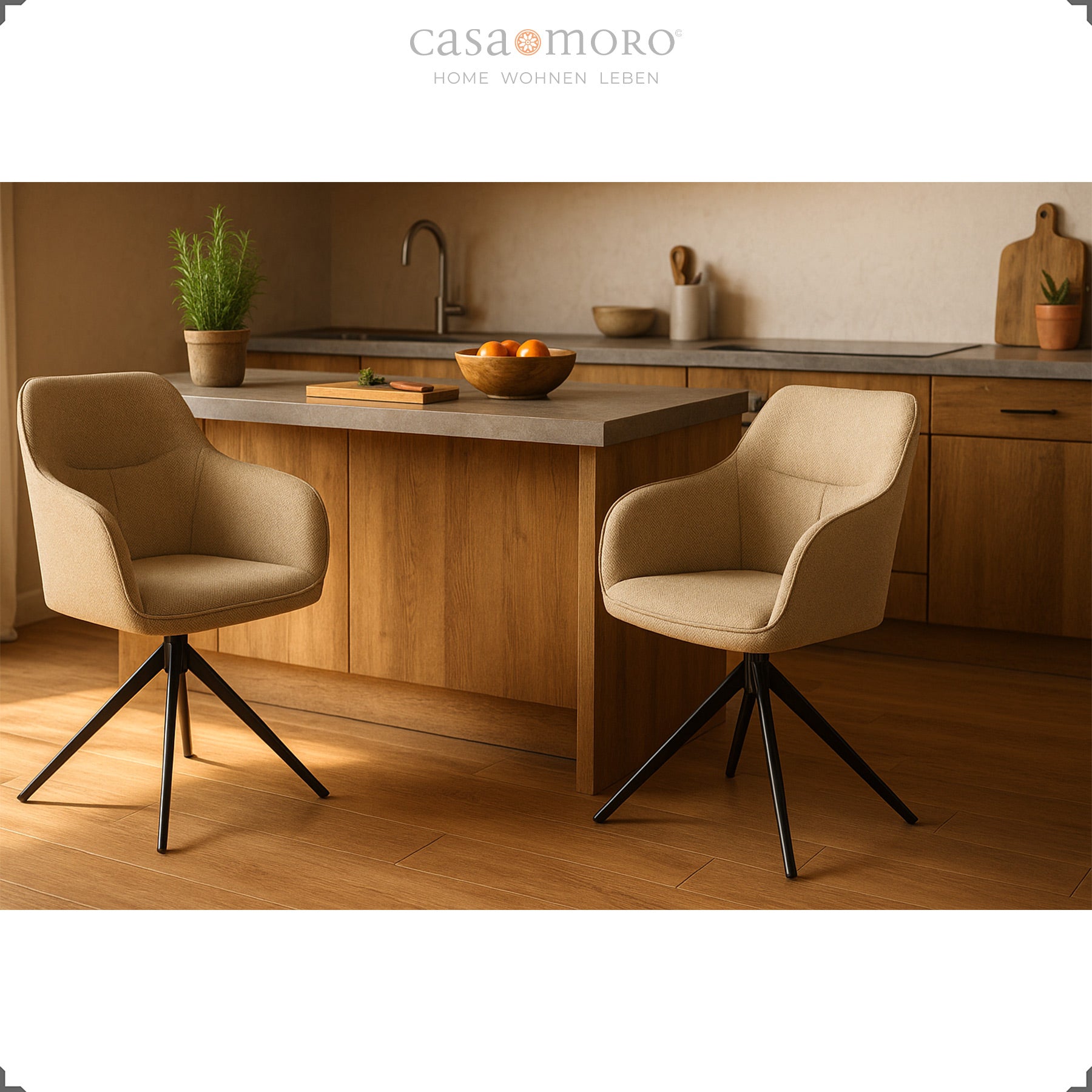 Zwei 360° drehbare Polsterstühle mit Armlehnen in Beige vor einer Kücheninsel aus Holz, warmes Licht betont den modernen und gemütlichen Stil