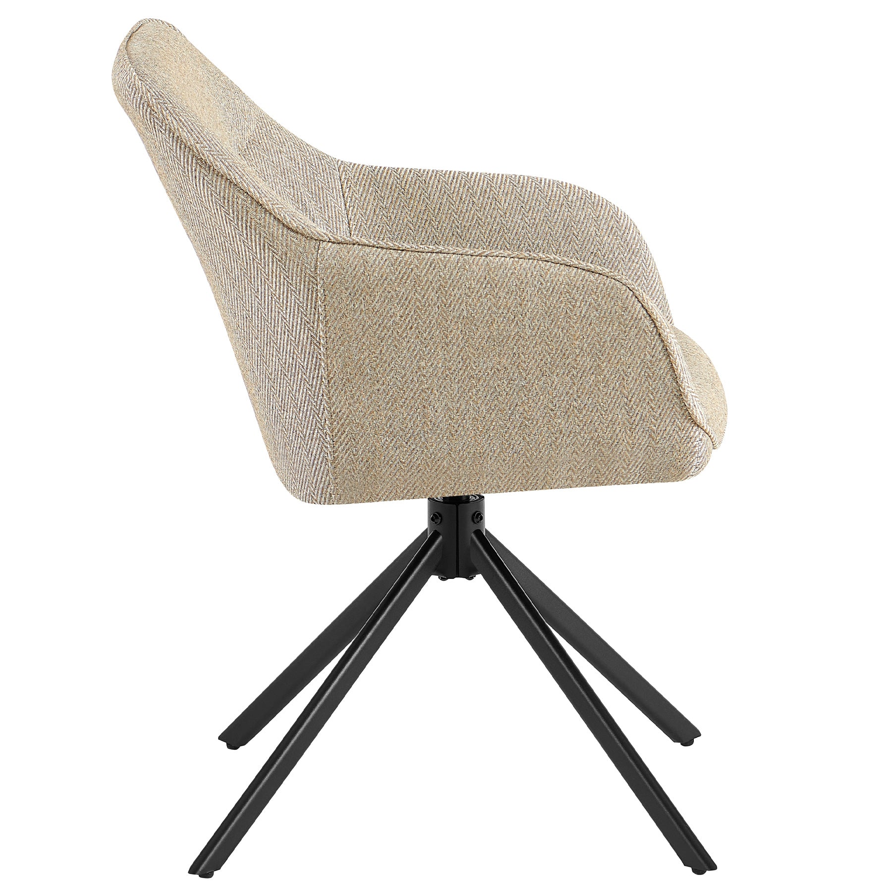 Seitenansicht eines 360° drehbaren Polsterstuhls mit Armlehnen in Beige, gepolstertem Strukturstoff und stabilem schwarzem Metallgestell
