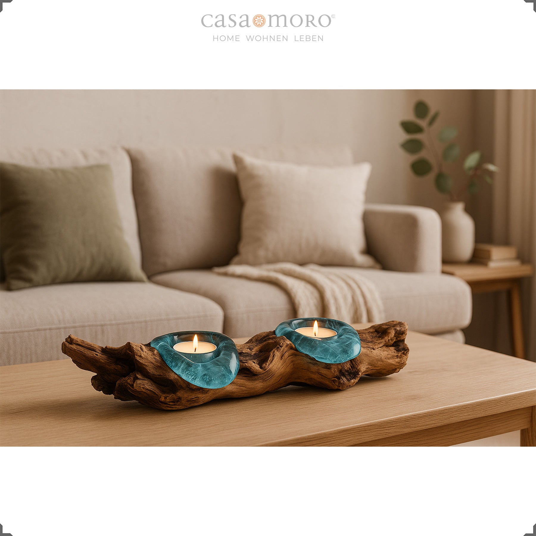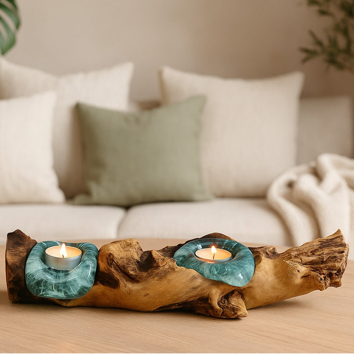 Länglicher Teelichthalter mit zwei Glasformen auf natürlichem Wurzelholz, dessen warmes Kerzenlicht sanfte Akzente setzt.