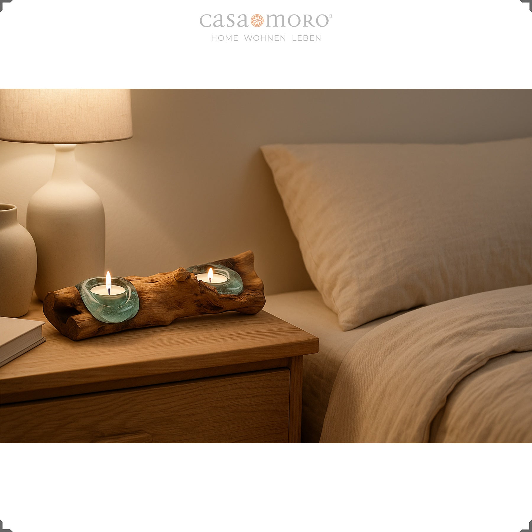 Länglicher Teelichthalter aus Glas und Wurzelholz auf einem Nachttisch, sein sanftes Licht schafft eine beruhigende Schlafzimmeratmosphäre.