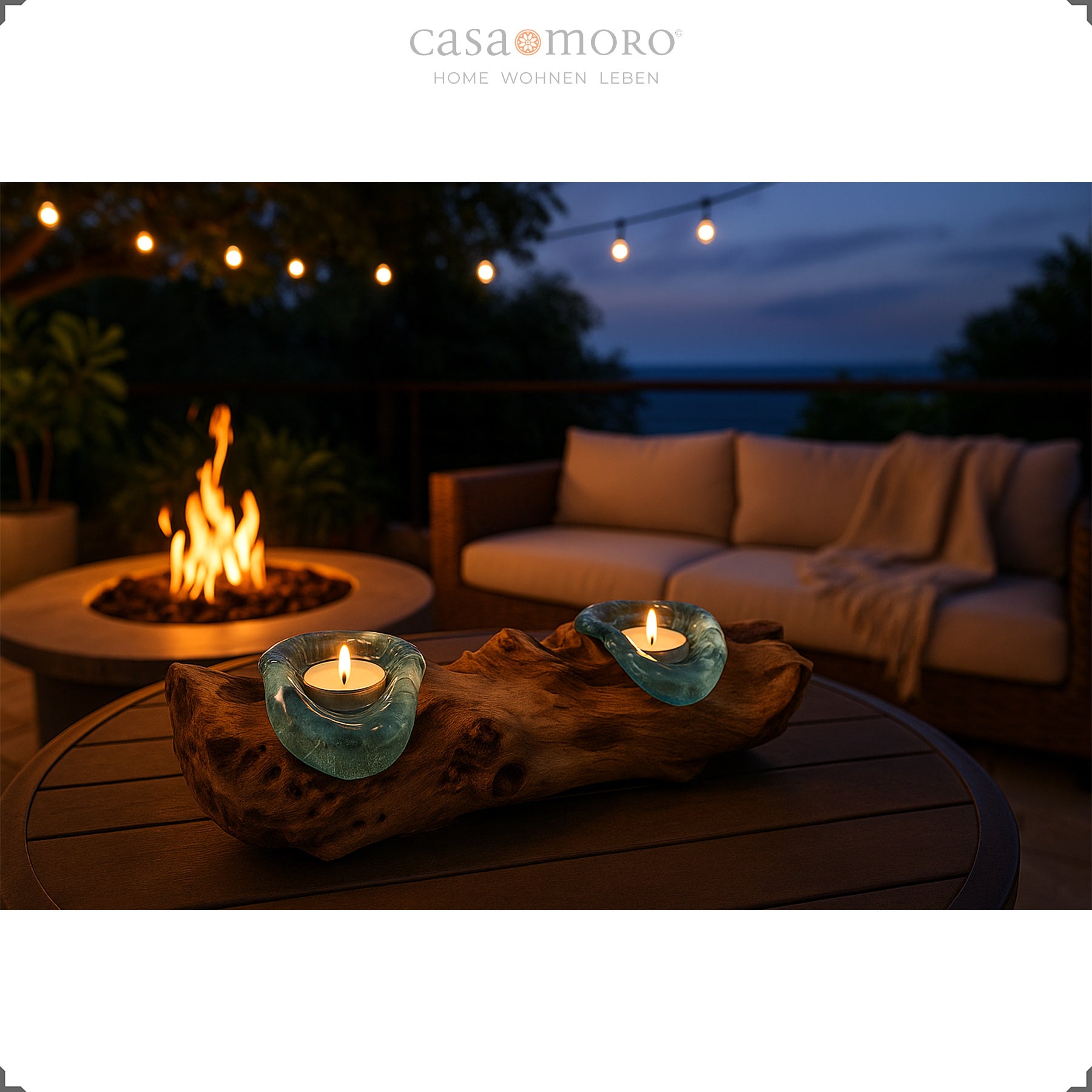 2er Teelichthalter aus Glas und Wurzelholz auf einem Outdoor-Tisch, sein warmes Licht ergänzt die gemütliche Abendstimmung auf der Terrasse.