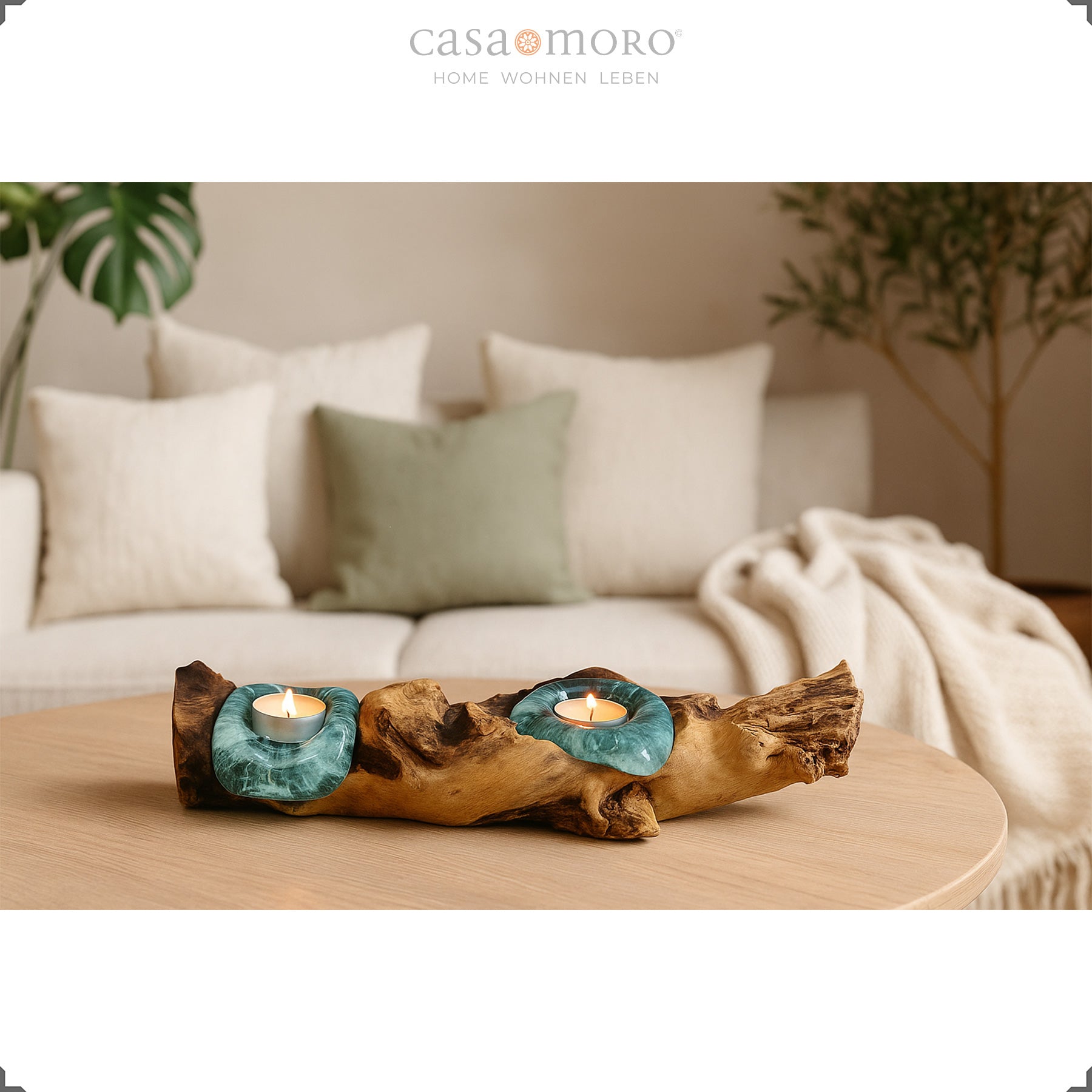Cada pieza es única: la estructura, el veteado y la forma de la madera de raíz siempre son diferentes, al igual que las finas vetas y las inclusiones en el vidrio. Son precisamente estas particularidades las que hacen que este portavelas sea tan especial. Ya sea como decoración central en la mesa, en el aparador del salón o en el alféizar de la ventana del dormitorio, este arreglo se integra fácilmente en estilos naturales modernos, interiores boho o habitaciones de inspiración escandinava.