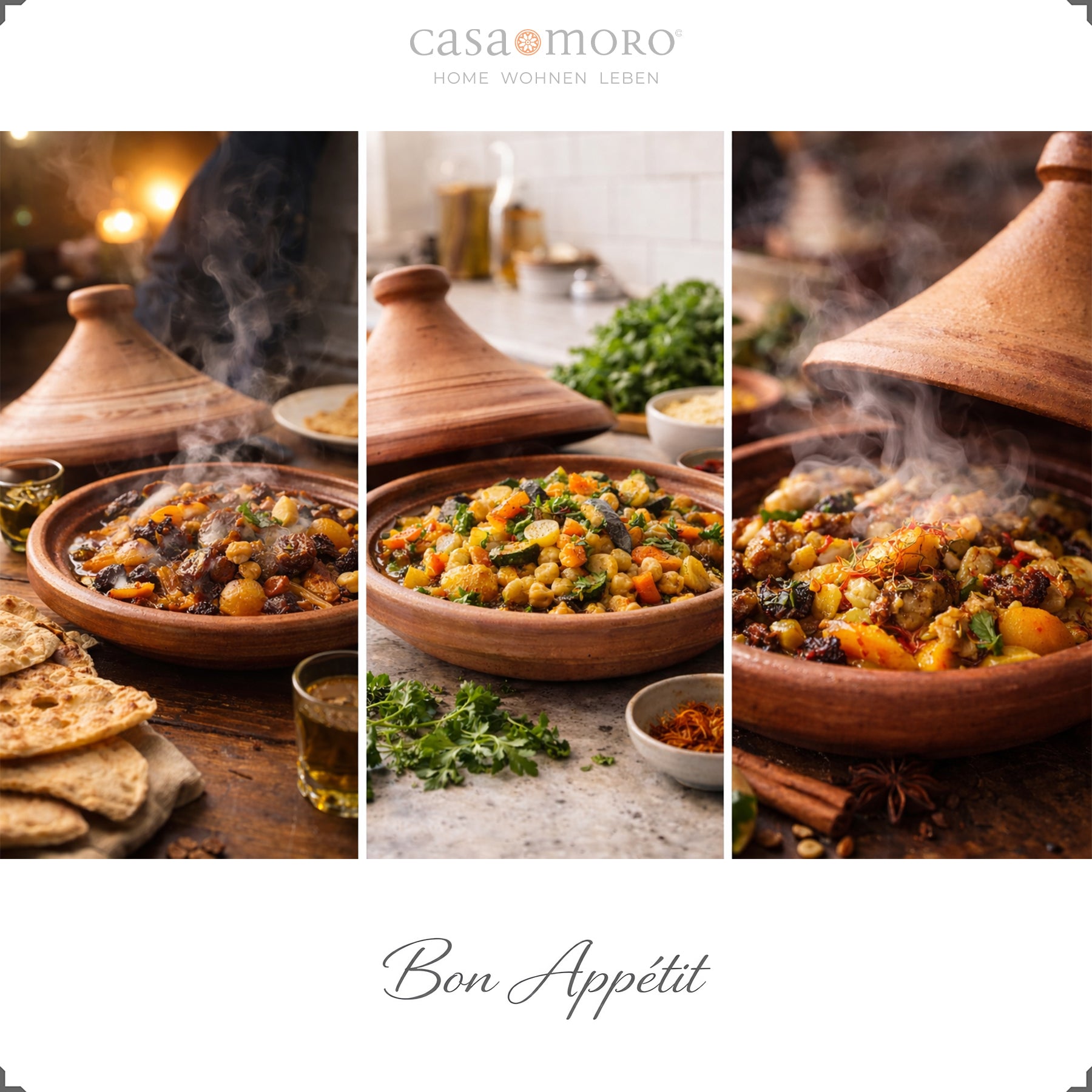 La tapa cónica garantiza una circulación natural del vapor: la humedad ascendente se condensa en la tapa y gotea sobre los ingredientes. De este modo se conservan de forma óptima las especias y la mezcla de especias. Ya sean recetas de inspiración marroquí con cordero, pollo o pescado, o platos vegetarianos con verduras y legumbres, el Tajine desarrolla aromas de forma especialmente intensa.